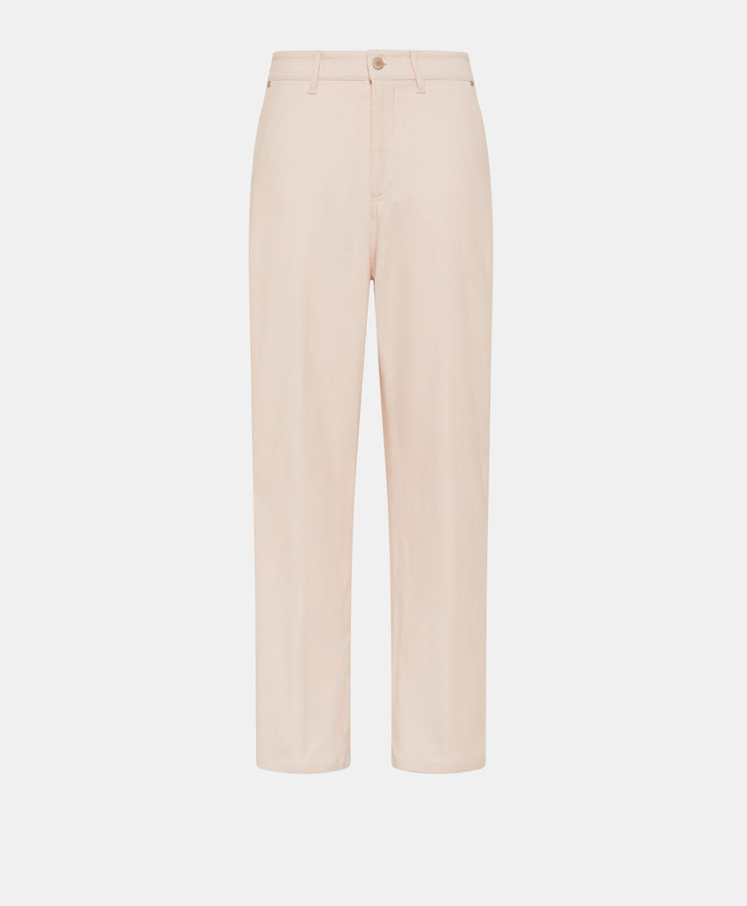Jean baggy revisité en denim extensible coloré. Poches fendues, taille classique, entrejambe légèrement descendu, jambe droite et revers. Couleur rose pale