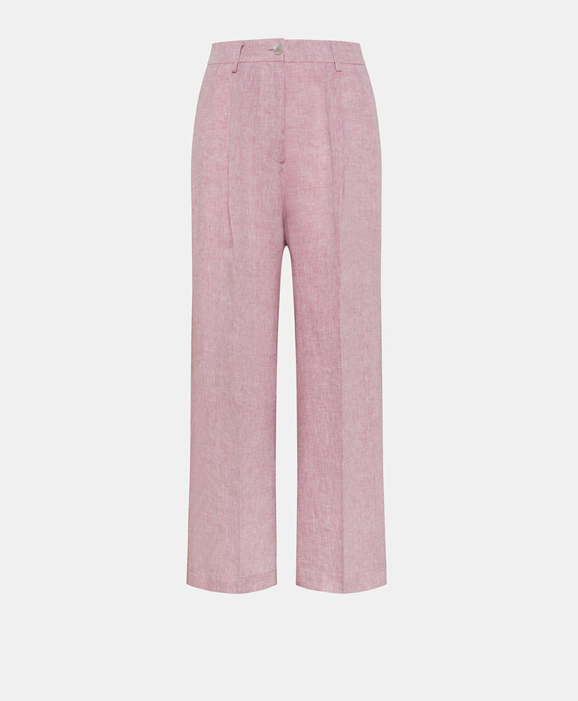 Pantalon long à la cheville en lin teint en fil. rose pale Jambe large, soulignée par des plis, sangle avec boucles, ouverture zippée et fermeture à crochet. Poches insérées sur le côté.